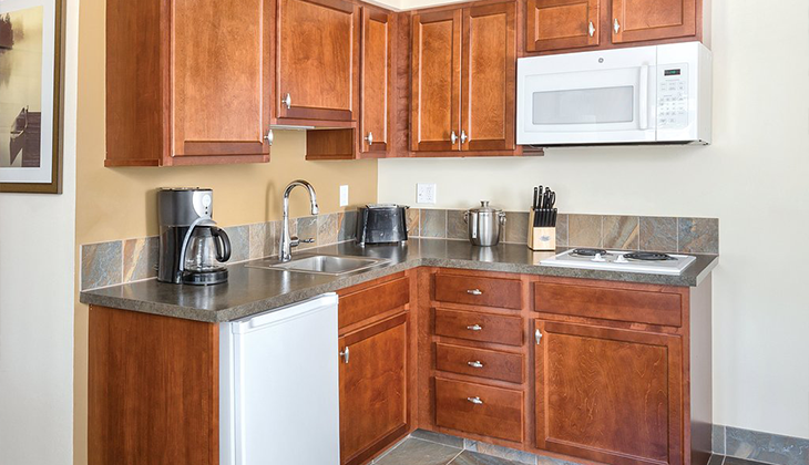 • Limited kitchen facilities with 2 burner stovetop, mini-fridge and no oven or dishwasher