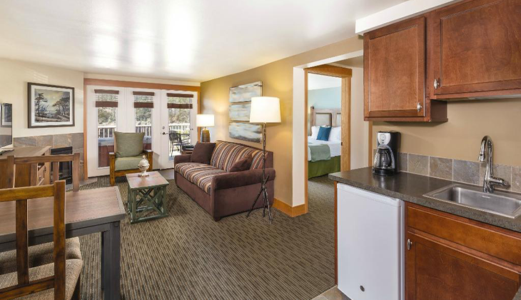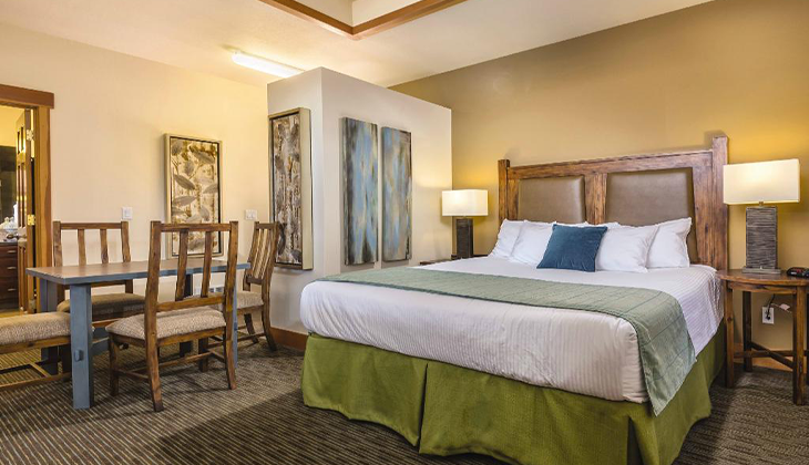 • King bed and queen sleeper sofa in living area.