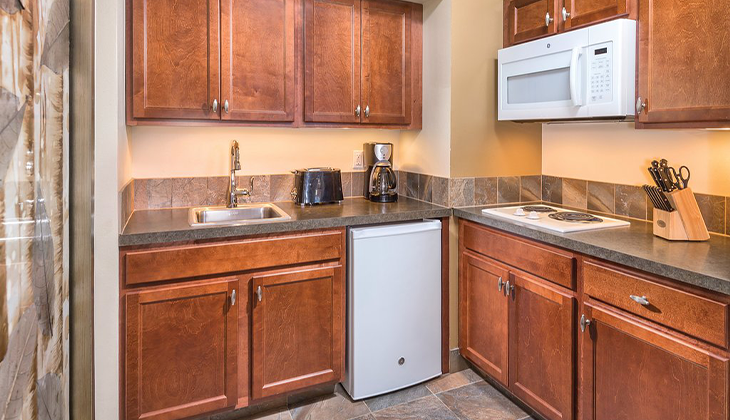 • Limited kitchen facilities with 2 burner stovetop, mini-fridge and no oven or dishwasher.
