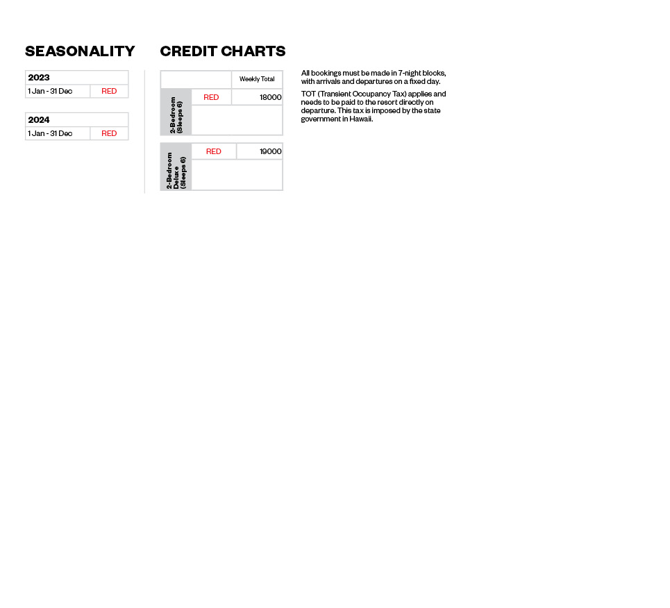 - TOT (Transient Occupancy Tax) of approximately $6 to $12 USD per night (2018 rates), depending on the apartment type, needs to be paid to the resort directly on departure. This tax is imposed by the state government in Hawaii, not dissimilar to the STT in place at Fiji.
